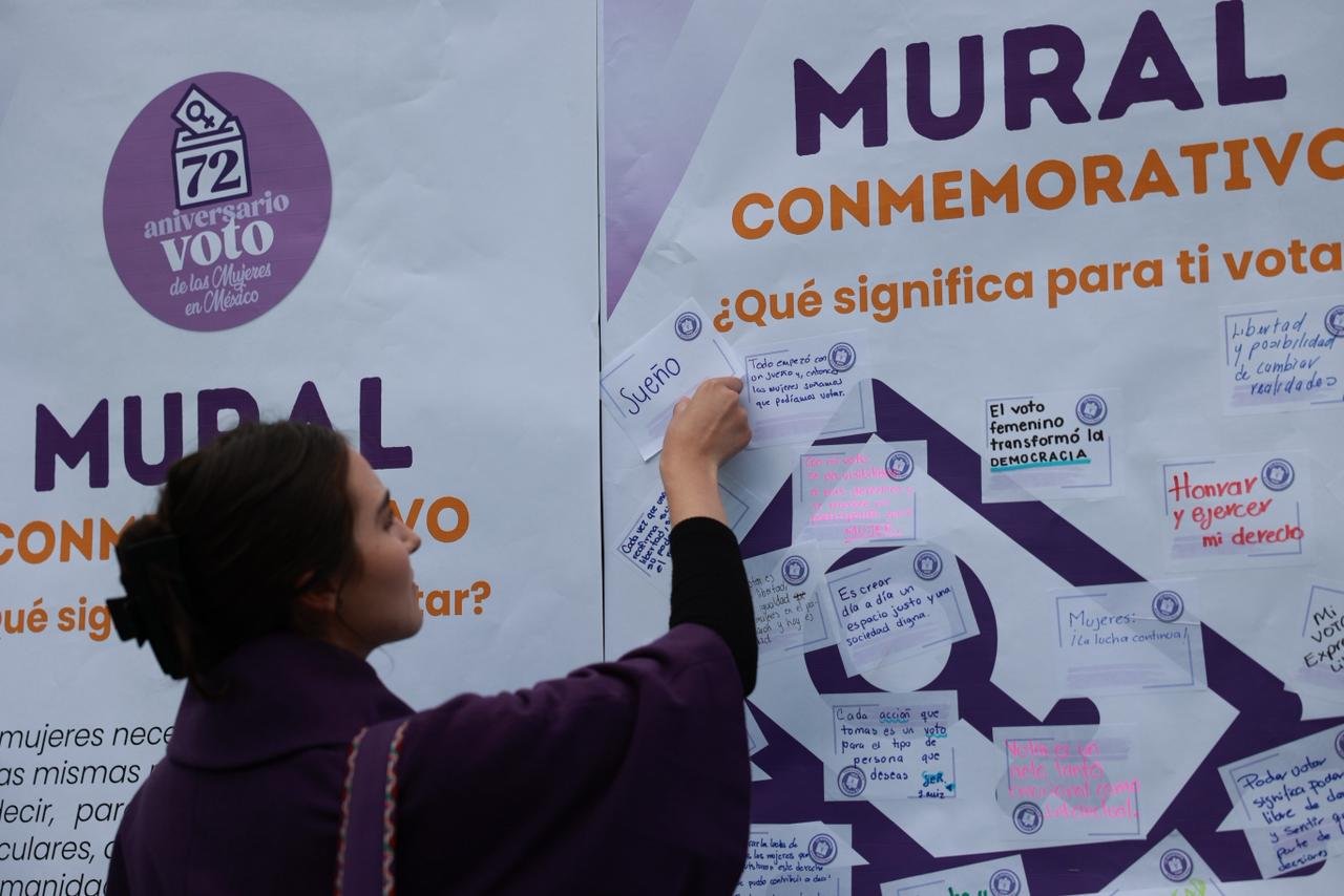 Además, en esta jornada el IEEM colocó un mural conmemorativo en la explanada del IEEM, donde las Consejeras Electorales Paula Melgarejo Salgado, Patricia Lozano Sanabria, Karina Ivonne Vaquera Montoya, July Erika Armenta Paulino y Flor Angeli Vieyra Vázquez así como servidoras públicas electorales de diferentes áreas del IEEM escribieron la respuesta a la pregunta “¿Qué significa para ti votar?” y las colocaron simbólicamente en un dibujo de urna, representando la voz y el poder de decisión de las mujeres.